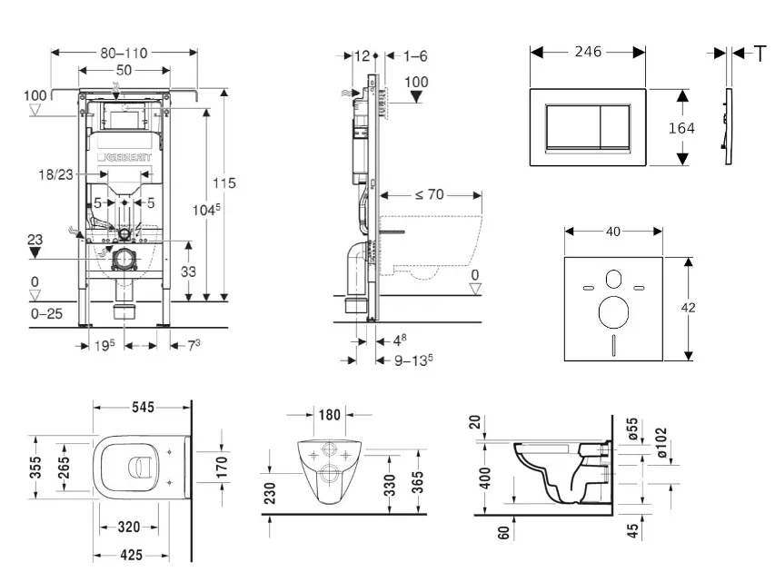Sæt med skillevægsinstallation, toilet, toiletsæde og kontrolknap