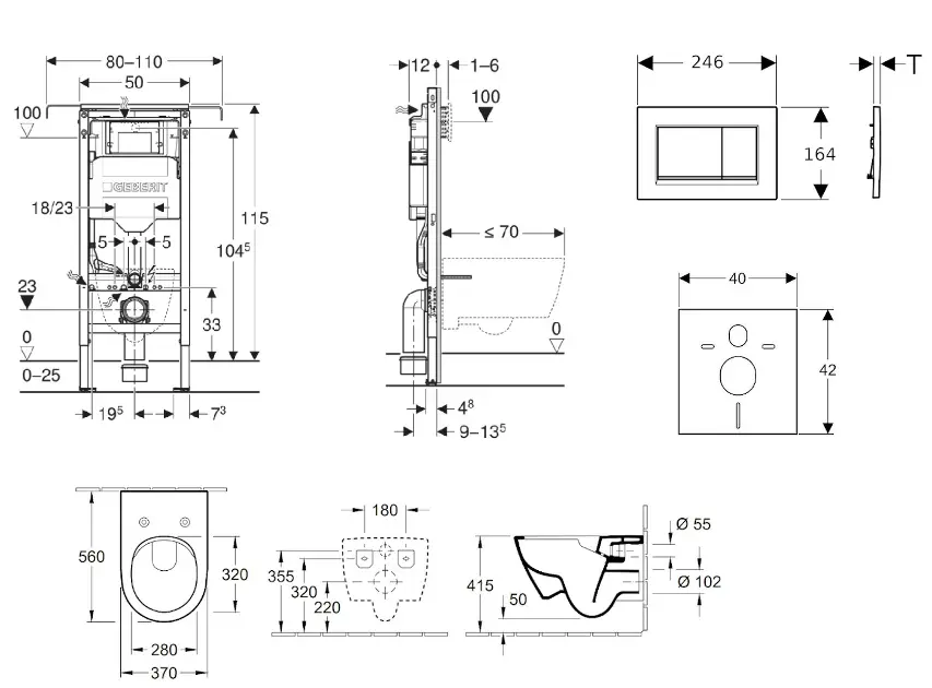 Sæt med skillevægsinstallation, toilet, toiletsæde og kontrolknap