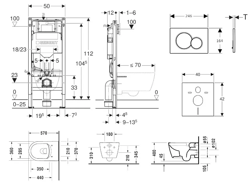 Sæt med skillevægsinstallation, toilet, toiletsæde og kontrolknap