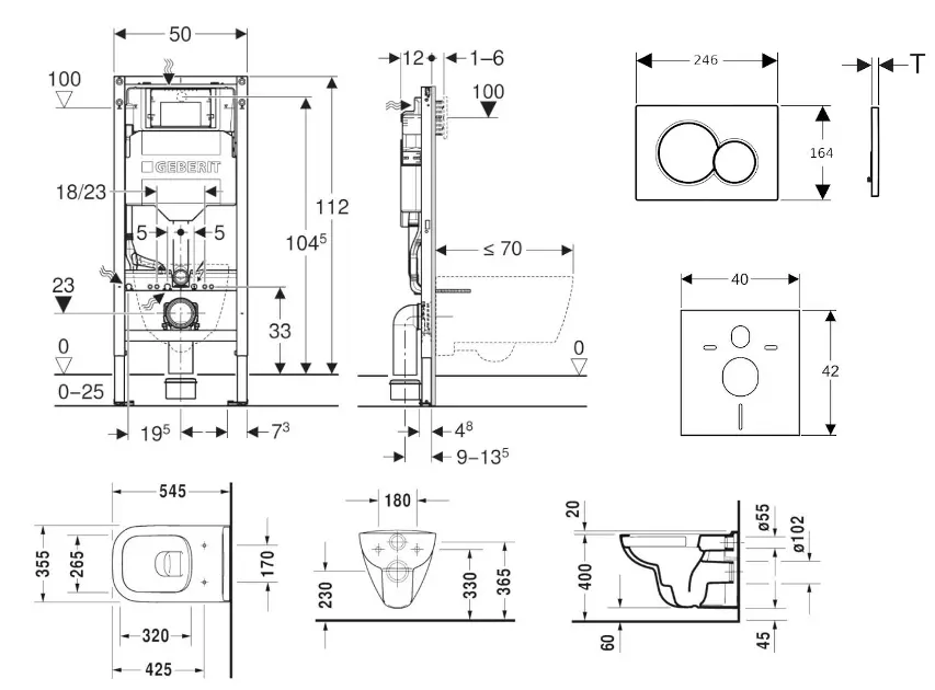 Sæt med skillevægsinstallation, toilet, toiletsæde og kontrolknap